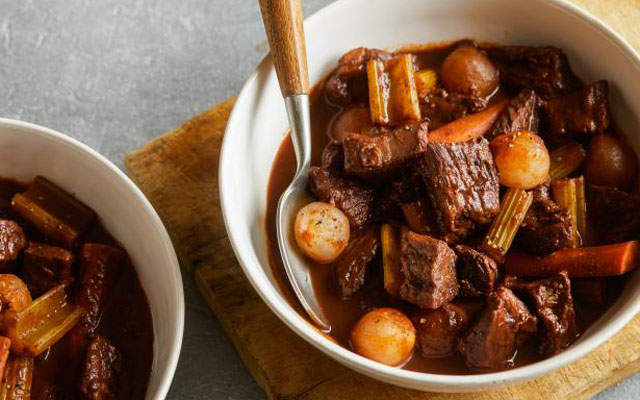 2. Meanwhile, toss the beef with the flour, 2 teaspoons salt, and a generous amount of pepper in a medium bowl. Add the meat and all the flour to the Instant Pot in a single layer and cook, undisturbed, until golden brown on the bottom, about 3 minutes. Stir once and allow to brown for another 2 to 3 minutes. Add the tomato paste and stir to coat. Add the wine and bring to a boil. Cook for 1 minute, scraping up browned bits from the bottom of the pot with a wooden spoon.
