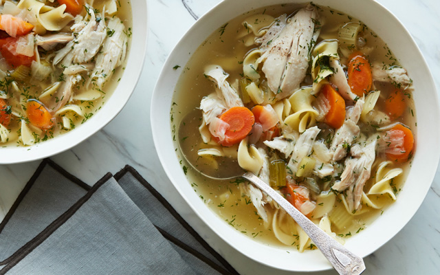 5. While the noodles are cooking, use 2 forks to remove the skin and bones from the chicken and shred the meat into bite-size pieces. Season the chicken generously with salt and pepper, then add the meat back to the pot along with the dill. Season the soup with additional salt and pepper if needed.
