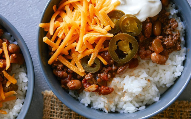 For serving: cooked rice, grated cheese, sour cream and pickled jalapenos (or your favorite chili toppings)