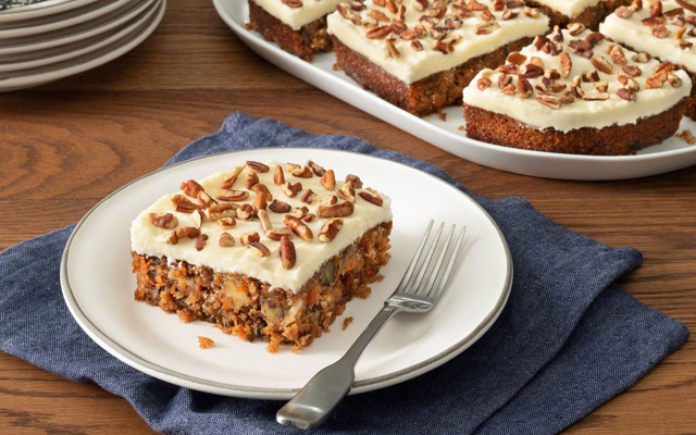 3. Spread frosting over the cooled cake and sprinkle with pecans.